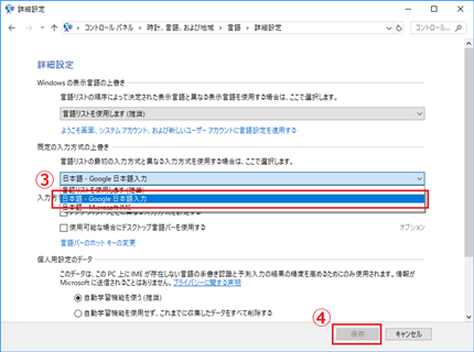 ③入力方式を選び(ここではGoogle日本語入力)、④保存をクリックすれば完了です。